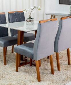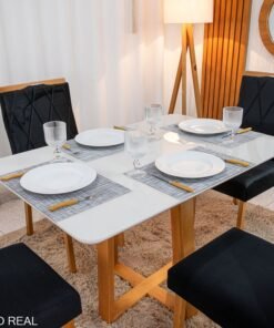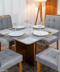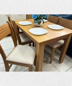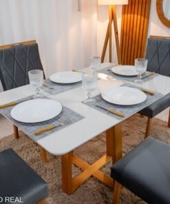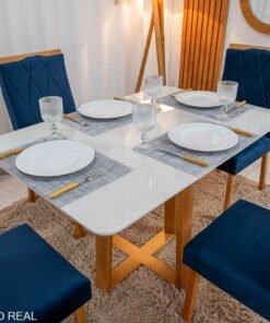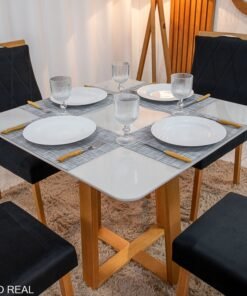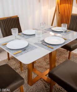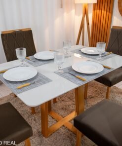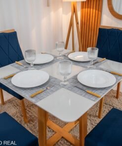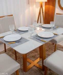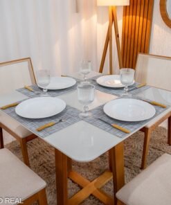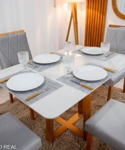 Mesa de Jantar Perla 110×75 Mel + 4 Cad. Brisa Linho Assento Bronze – Viero