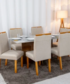 Mesa de Jantar Londrina 180×90 Cinamomo Rufato + 6 Cad. Dubai Linho Bege Madeira – Art Assento