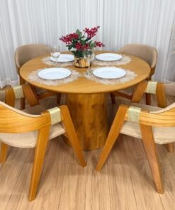 Mesa de Jantar Paris Circular 1.10×1.10 c/4 Cadeiras Grécia – Cinamomo Laminado/Bege Linho