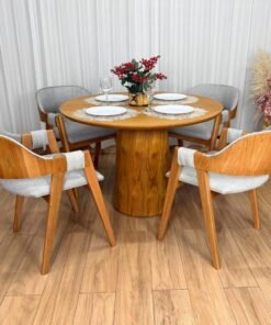 Mesa de Jantar Paris Circular 1.10×1.10 c/4 Cadeiras Pérola – Cinamomo Laminado/Cinza Linho