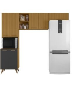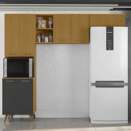 3{%%}Descrição{%%}Armário Cozinha Olinda Freijó/Grafite Paneleiro + Aéreo 1.05m + Aéreo de Geladeira Ripado 3D – Poliman