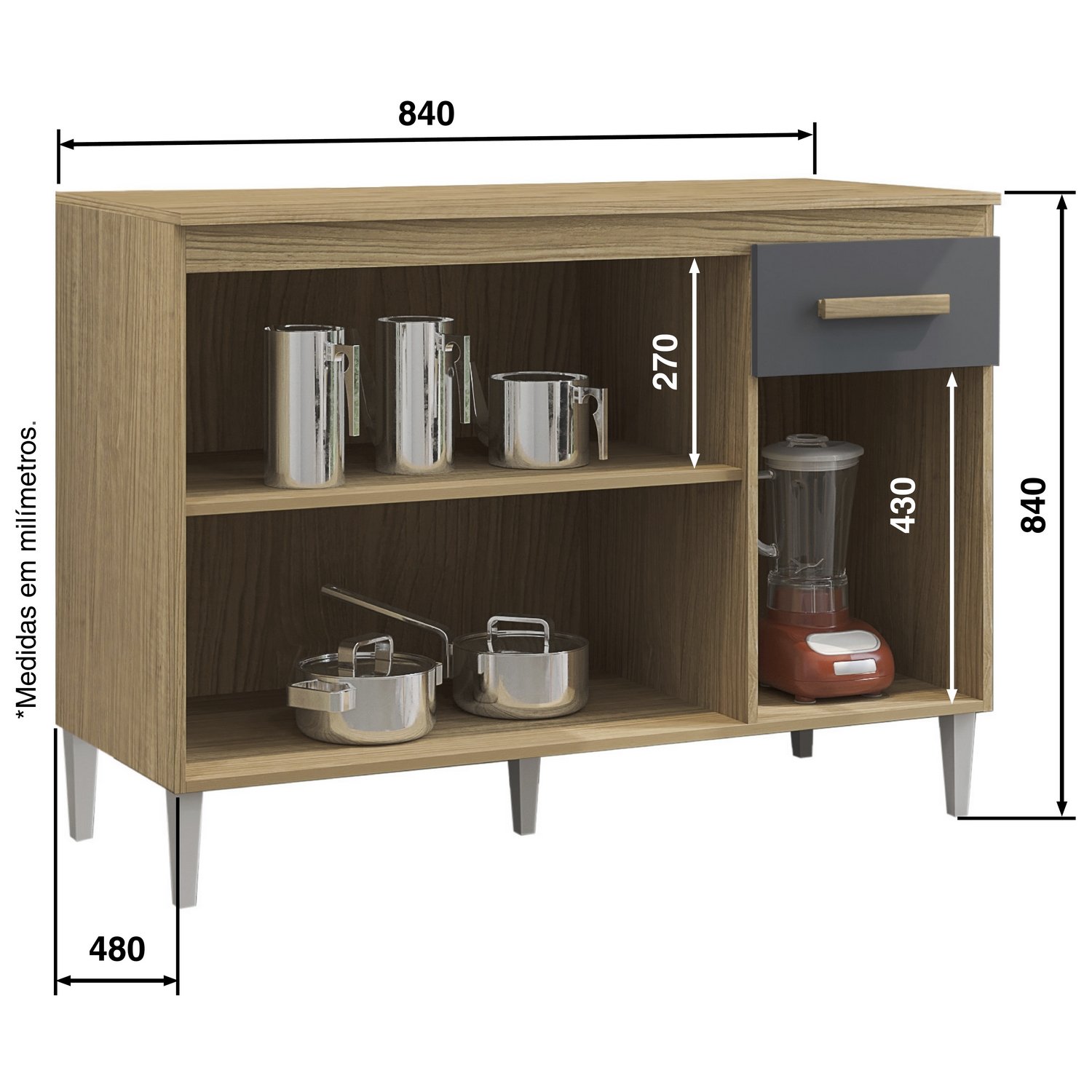 – Uma gaveta com corrediças metálicas