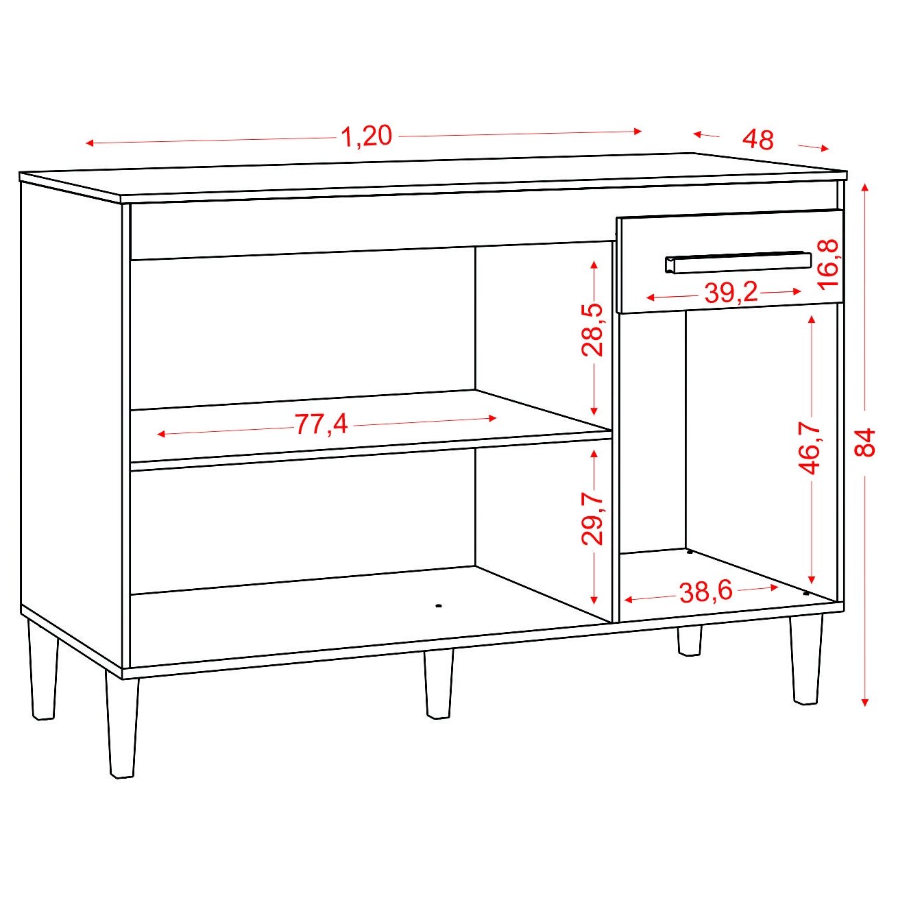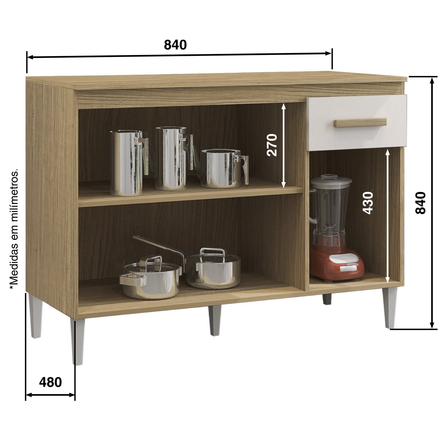 – Uma gaveta com corrediças metálicas