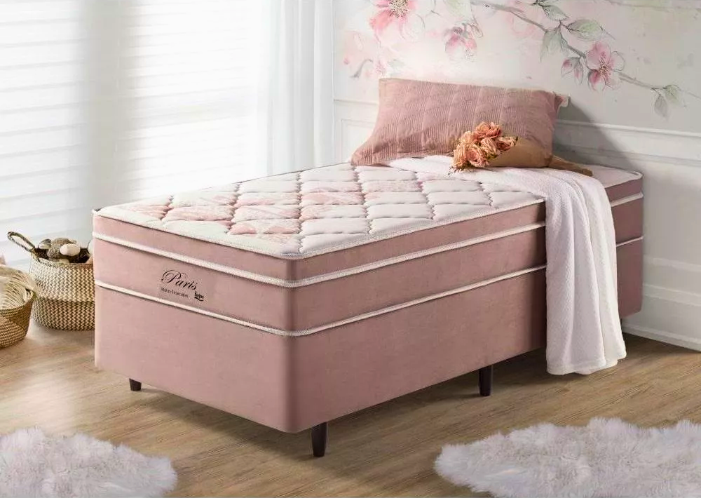 3{%%}Descrição{%%}Box Rosa + Colchão Solteiro Eiffel Molas Superlastic 88x188x68 Anjos