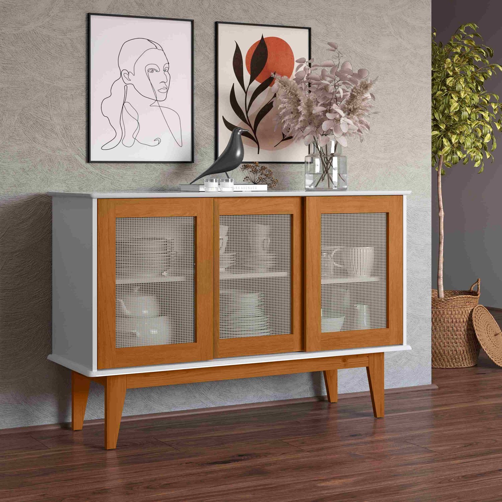 Buffet Detroit 3 Portas, Côr Branco/Nature, da Tebarrot Brasil, Medidas: Alt 0,825m Larg 1,25m Prof 0,423m Peso 296Kg – 1 Volume – Estrutura MDP 15mm, Tampo MDF 18mm e Base e Pés de Madeira Maciça de Pinus, 3 Portas de Correr com Roldana Metálicas e com Detalhes de Tela de Fios Sintéticos, 5 Nichos Internos, Pintura UV com Acabamento Semibrilho. Suporta até 23Kg Distribuídos Uniformemente.