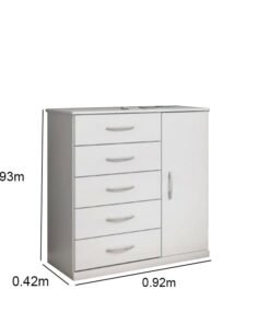 3{%%}Descrição{%%}Cômoda Vane 012 Branco 5 Gavetas 1 Porta Larg. 0.92m – JL Móveis