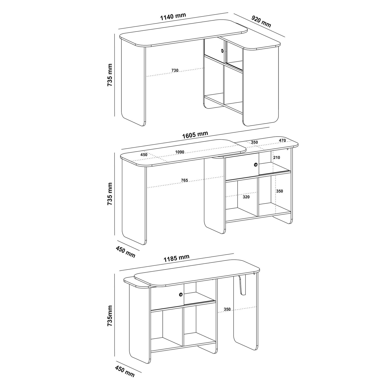 • Estrutura flexível: pode ser usada em L, reta ou fechada, graças ao tampo com rotação