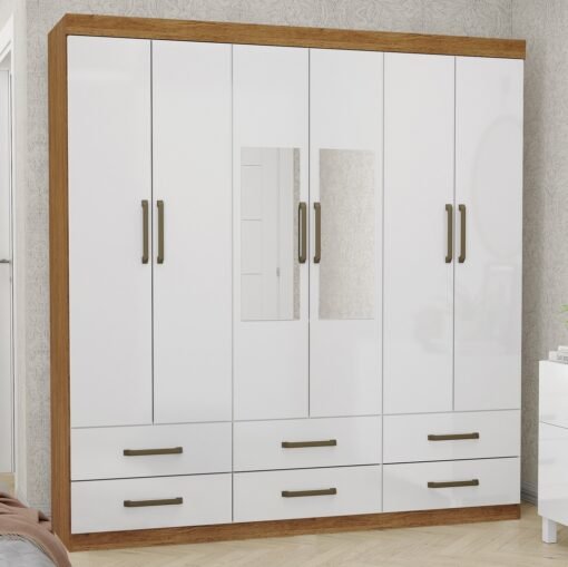 Guarda-Roupa 6 Portas(Com Espelho/Sem Pés)Dallas 1,53 m Cinamono/Branco – CARIOCA MÓVEIS