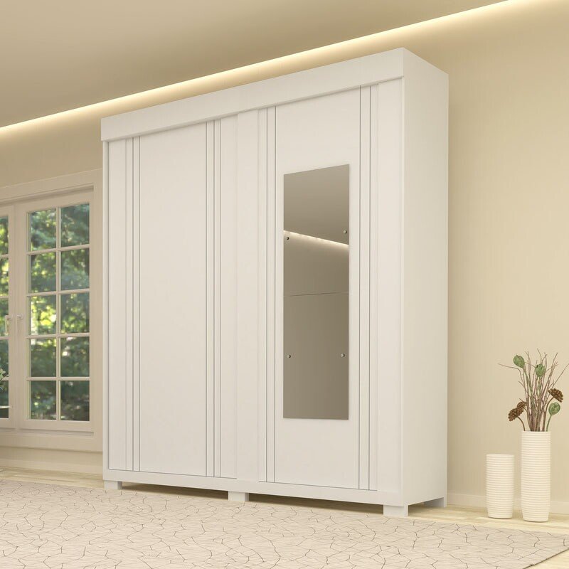 3{%%}Descrição{%%}Roupeiro Heloisa Branco 2 Portas C/ 1 Espelho e Pés 100% MDF Larg. 1.80m – ACP
