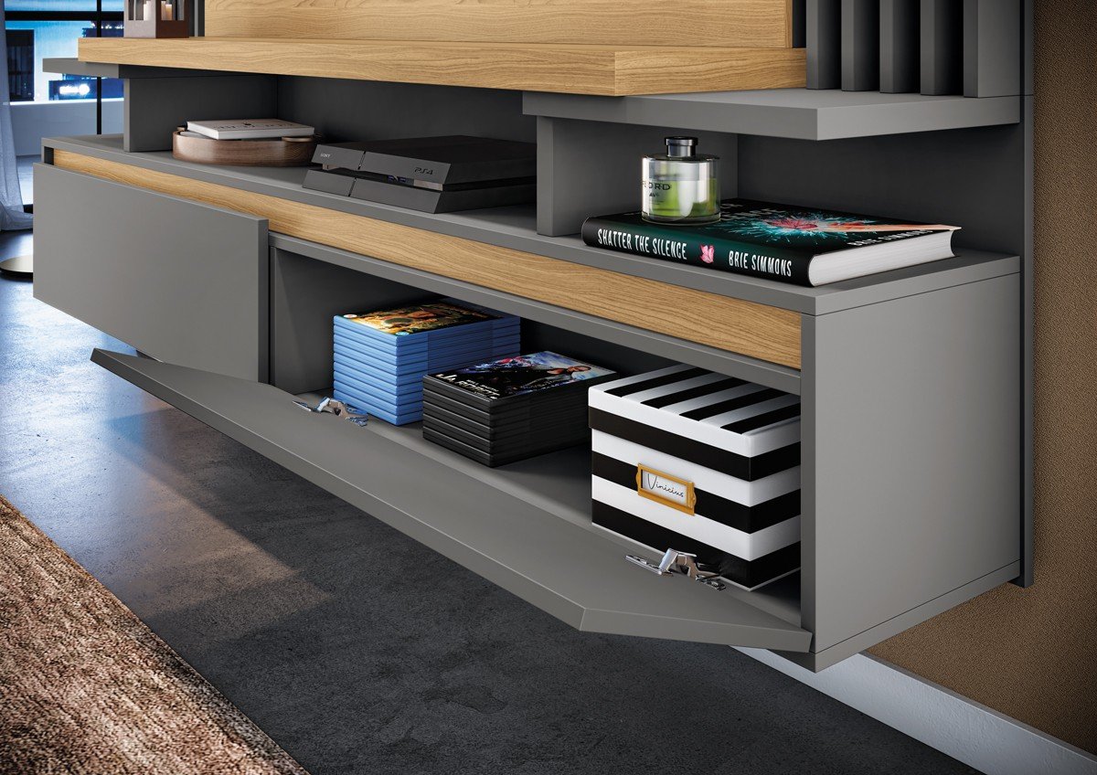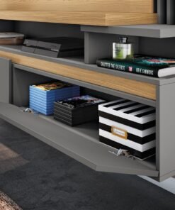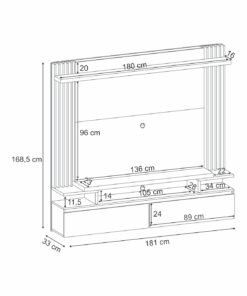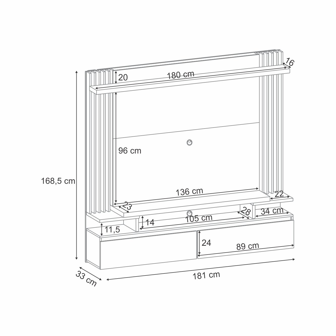 – Espaço para TV: 136 cm x 96,5 cm x 23 cm (LxAxP)