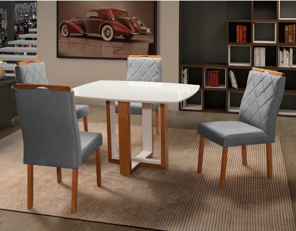 Mesa Atlas Mel/Off White Canto Barril 120×90 com 4 Cadeiras Lisboa Cinza – ART ASSENTOS