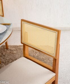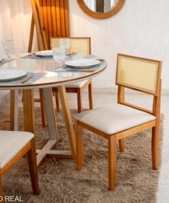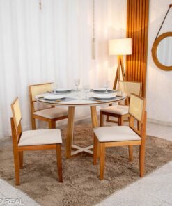 3{%%}Descrição{%%}Mesa de Jantar Atlanta Redonda 120cm Cinamomo/Vidro Off 4 Cad. Santorini Linho Bege Madeira Maciça – Minas Plac