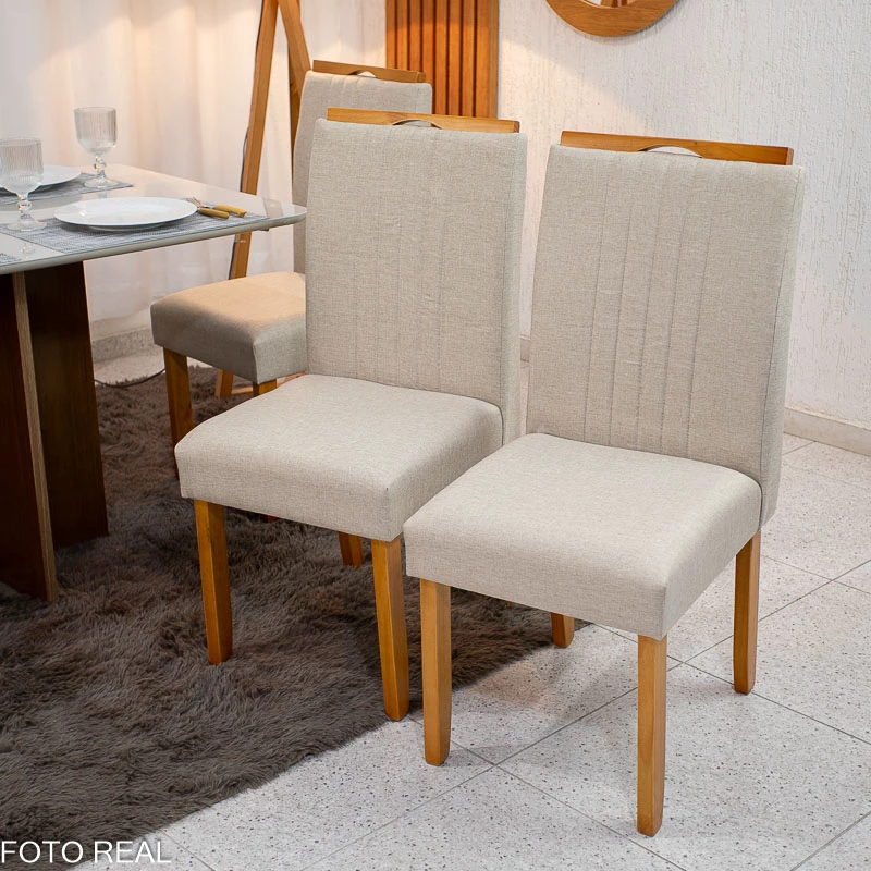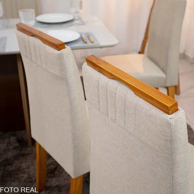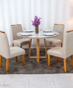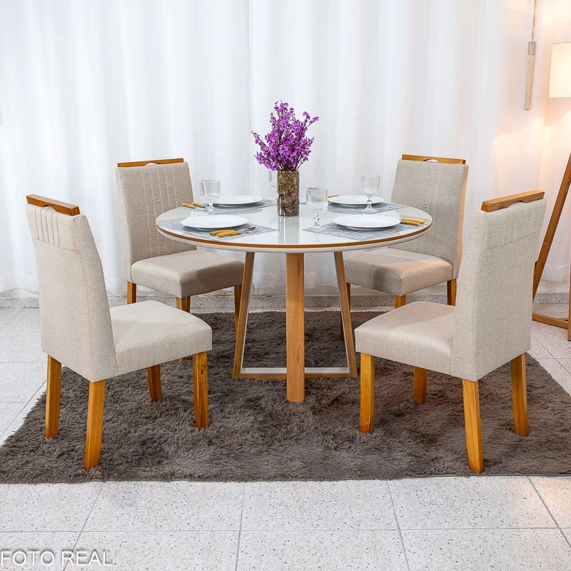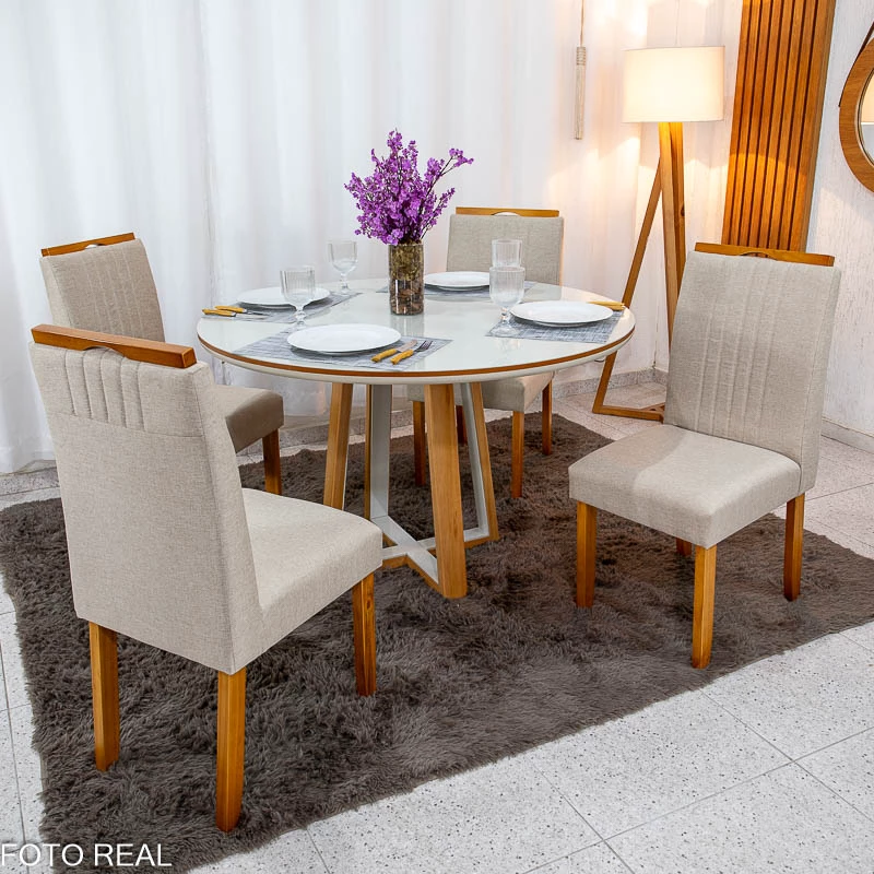Mesa de Jantar Atlanta Redonda 120cm Vidro Off/Base Madeira + 4 Cad. Atlanta Linho Bege Cru Madeira Minas Plac – Entregue Montada
