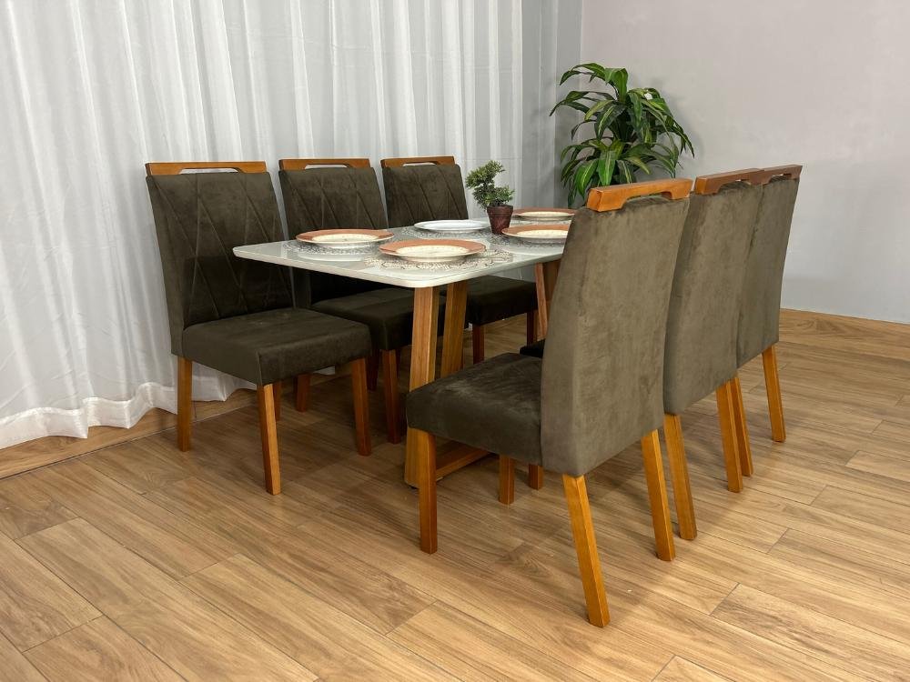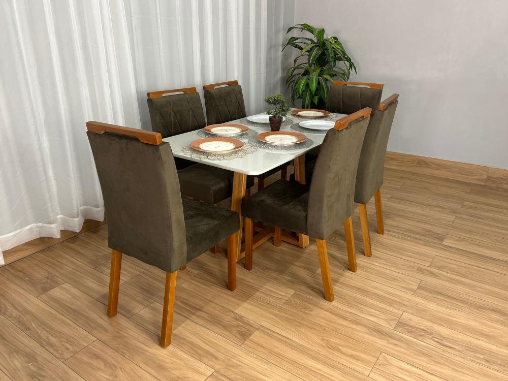 Mesa de Jantar Bali 1.60×0.80 Com 6 Cadeiras Isa – Cinamomo/Off White/Marrom Veludo