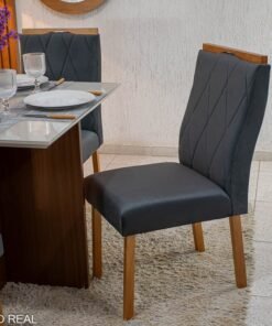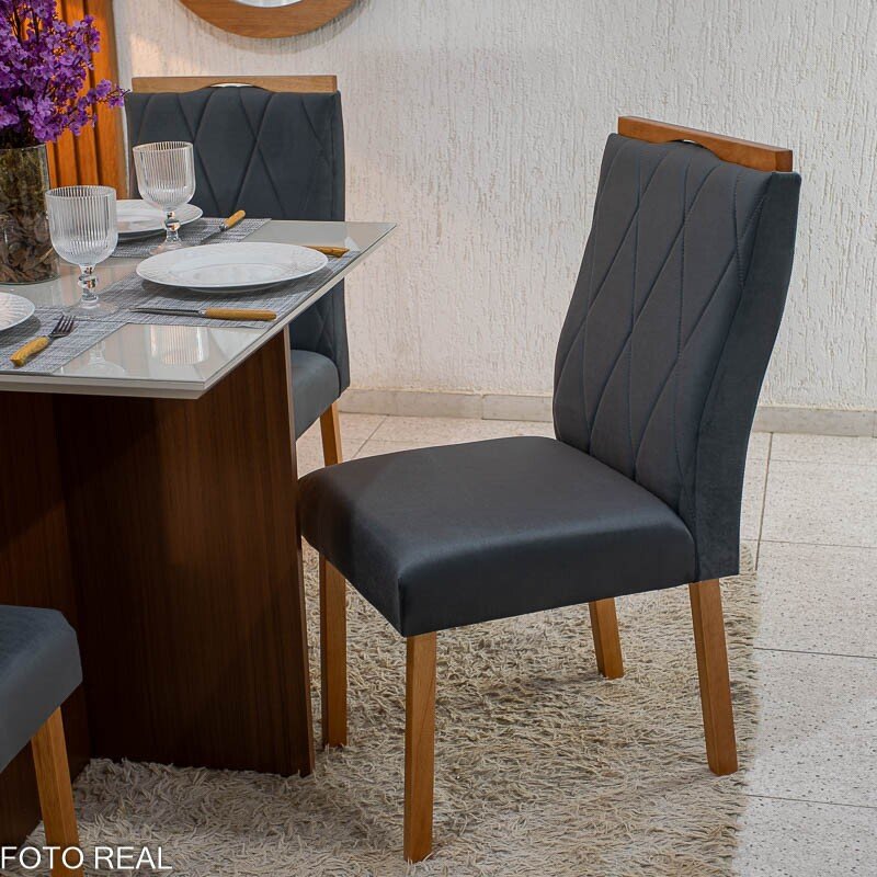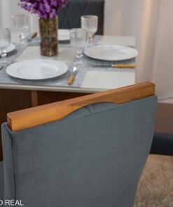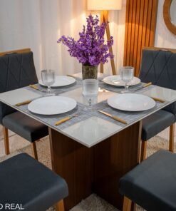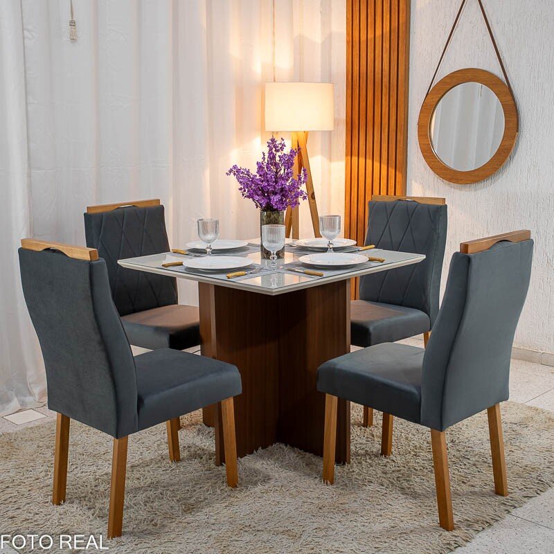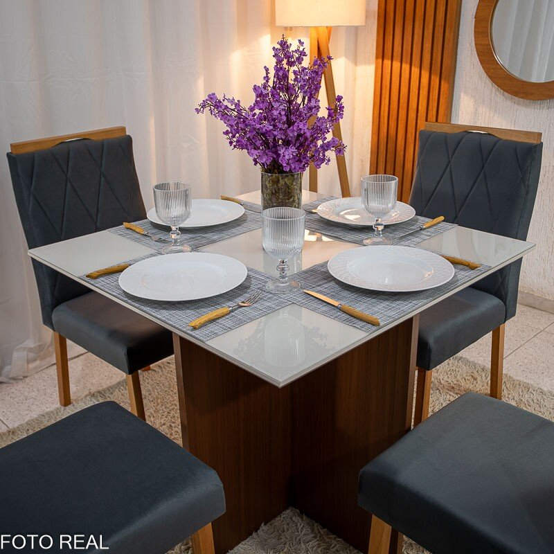 3{%%}Descrição#Como montar{%%}Mesa de Jantar Helo 90×90 Tampo MDF Vidro Off 4 Cad. Lisboa Veludo Cinza 507 Madeira Maciça