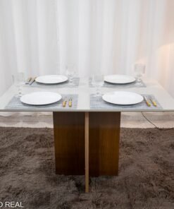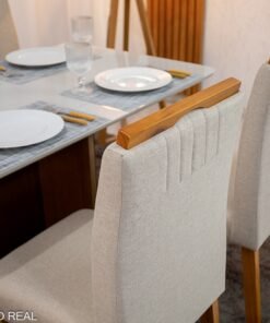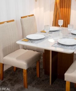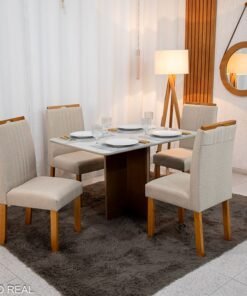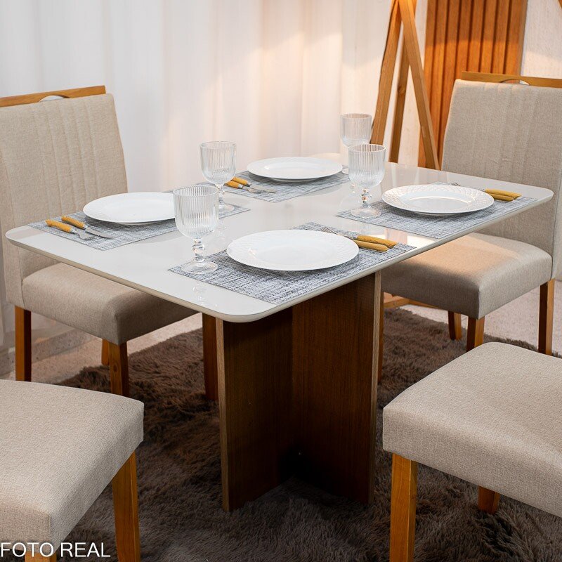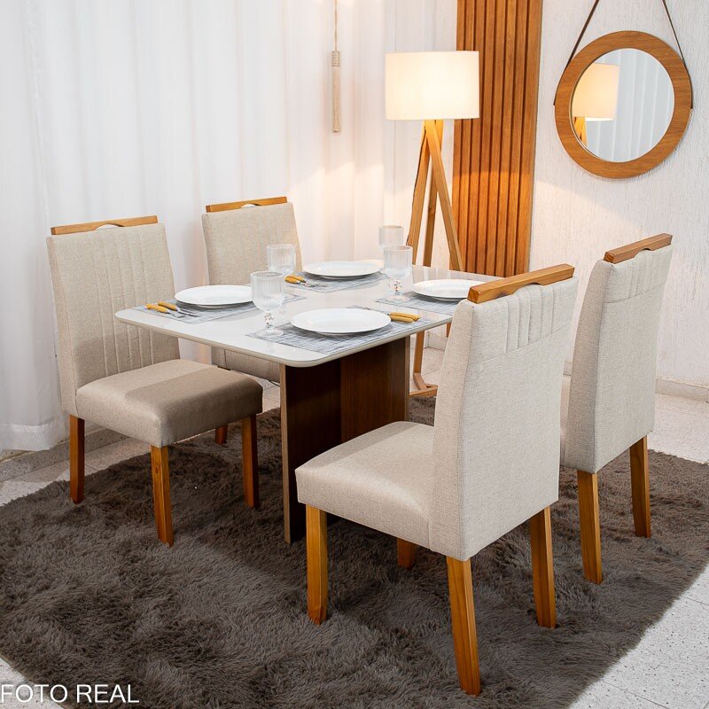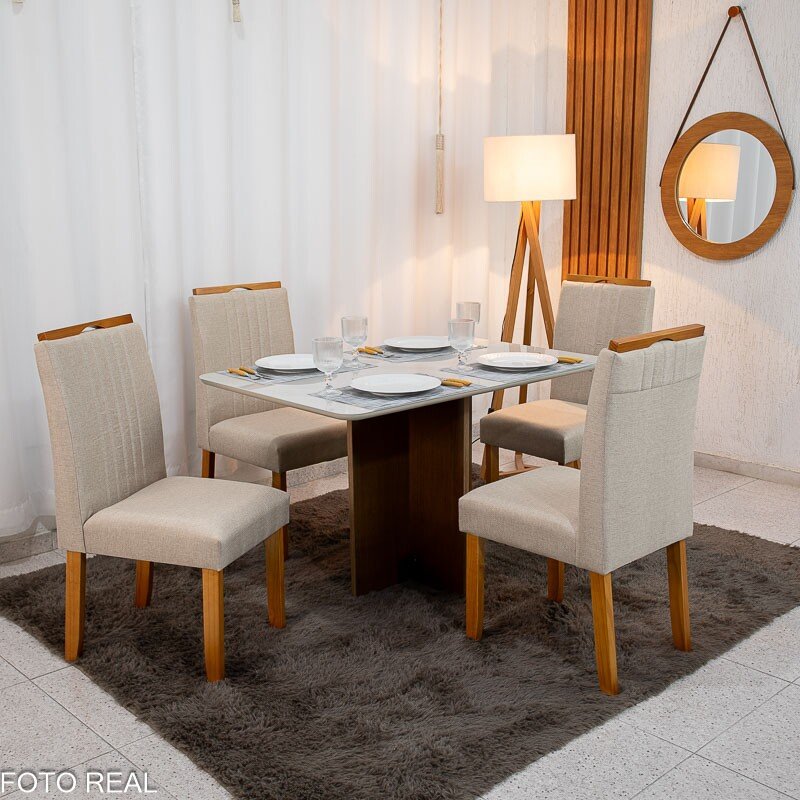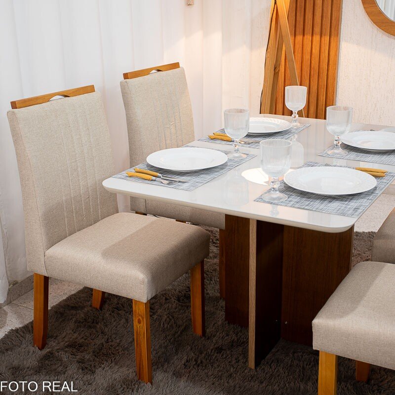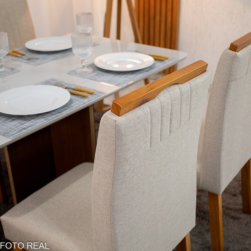 Mesa de Jantar Moscou 120×80 Cinamomo/Vidro Off + 4 Cad. Atlanta Linho Bege Cru Madeira Maciça Minas Plac – Entregue Montada