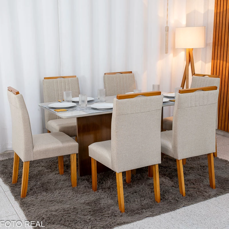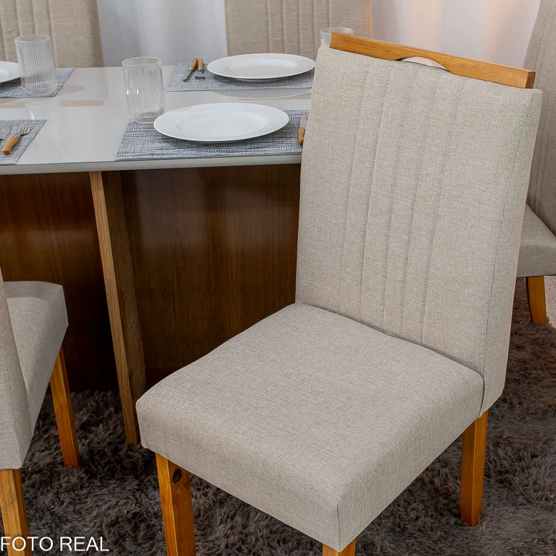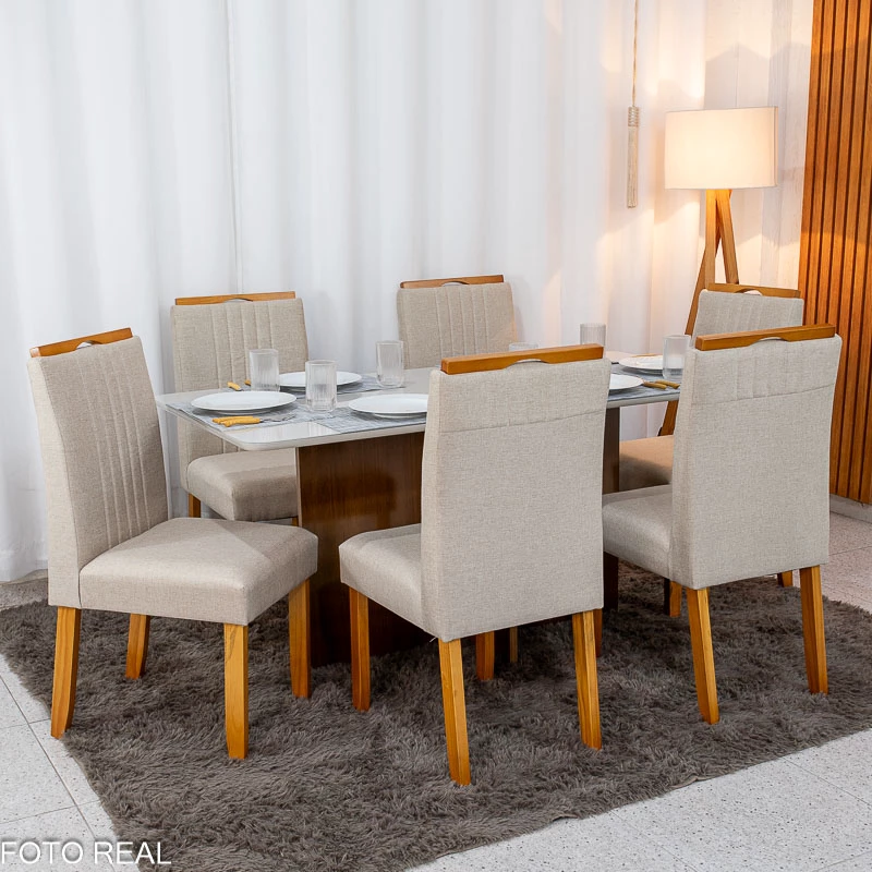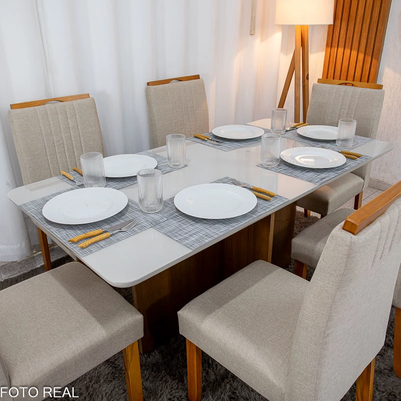 Mesa de Jantar Moscou 160×80 Vidro Off/Base Cinamomo + 6 Cad. Atlanta Linho Bege Cru Madeira Minas Plac – Entregue Montada