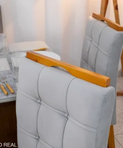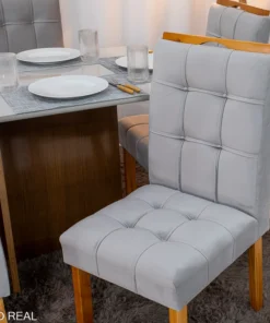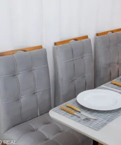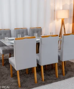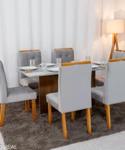 Mesa de Jantar Moscou 160×80 Vidro Off/Base Cinamomo + 6 Cad. Londres Veludo Prata Madeira Minas Plac – Entregue Montada