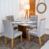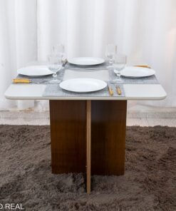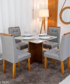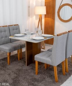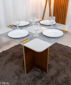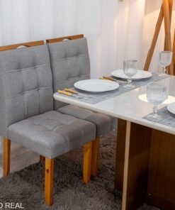 3{%%}Descrição{%%}Mesa de Jantar Moscou 90×90 Vidro Off/Base Cinamomo + 4 Cad. Londres Linho Cinza Madeira Minas Plac – Entregue Montada