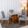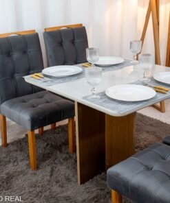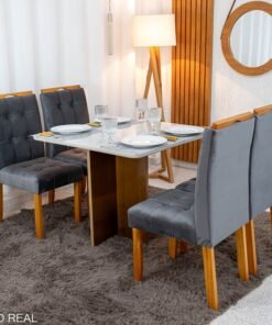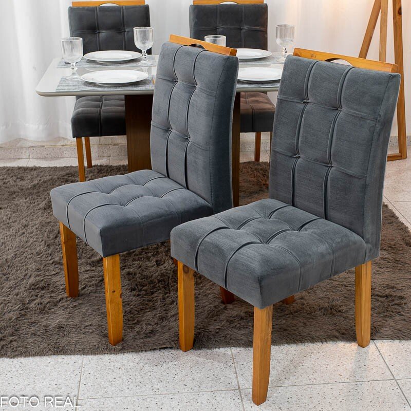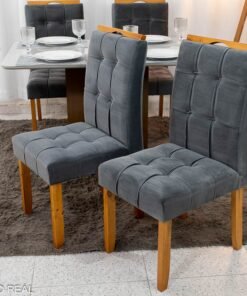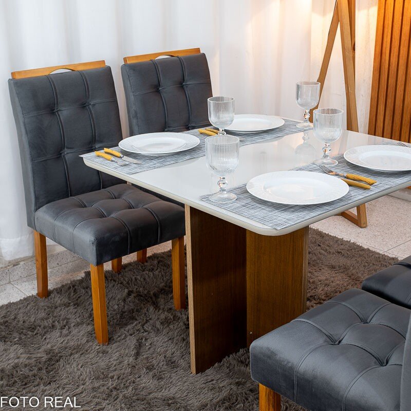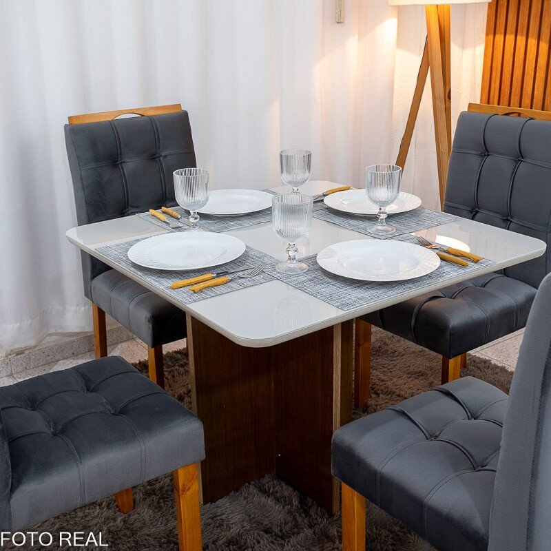 3{%%}Descrição{%%}Mesa de Jantar Moscou 90×90 Vidro Off/Base Cinamomo + 4 Cad. Londres Veludo Chumbo Madeira Maciça Minas Plac – Entregue Montada