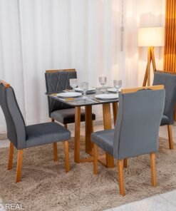 3{%%}Descrição#Como Montar{%%}Mesa de Jantar Pedro Mel Vidro Grafite 90×90 4 Cadeiras Lisboa Veludo Grafite 507 Madeira Maciça Art Assento – Entregue Montada