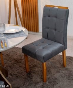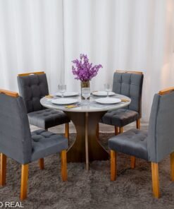 3{%%}Descrição{%%}Mesa de Jantar Siena Redonda 100cm Vidro Off/Base Cinamomo + 4 Cad. Londres Veludo Chumbo Madeira Minas Plac – Entregue Montad