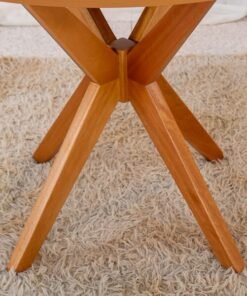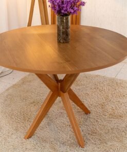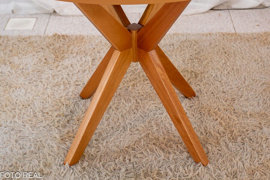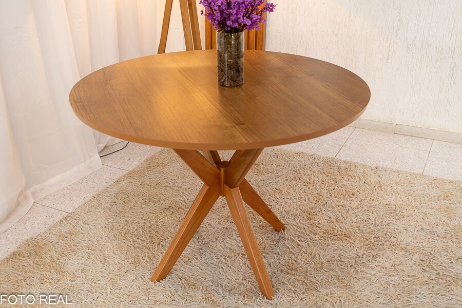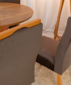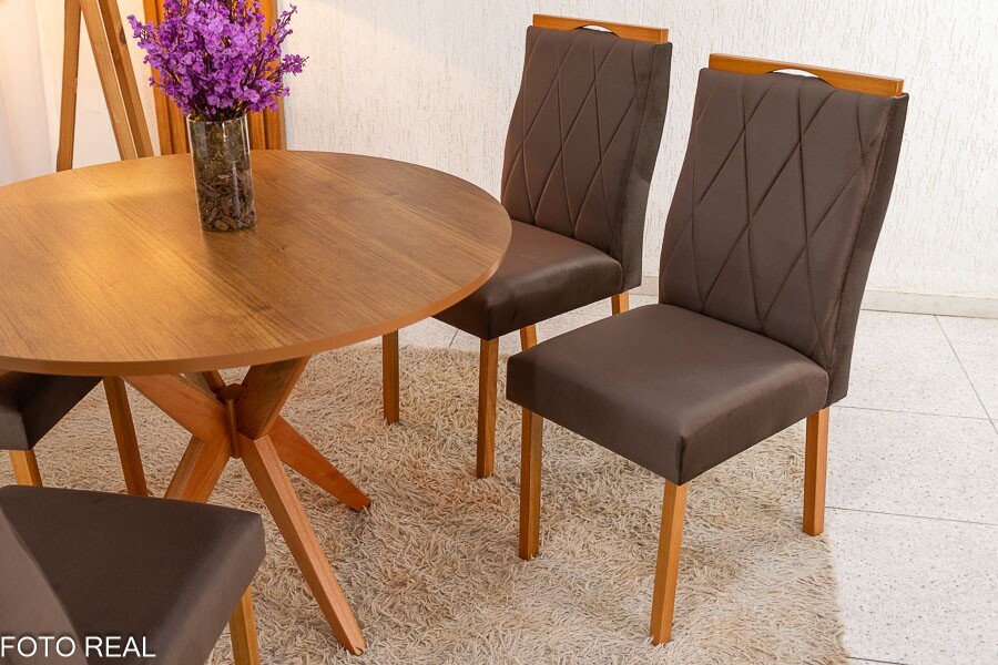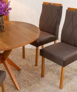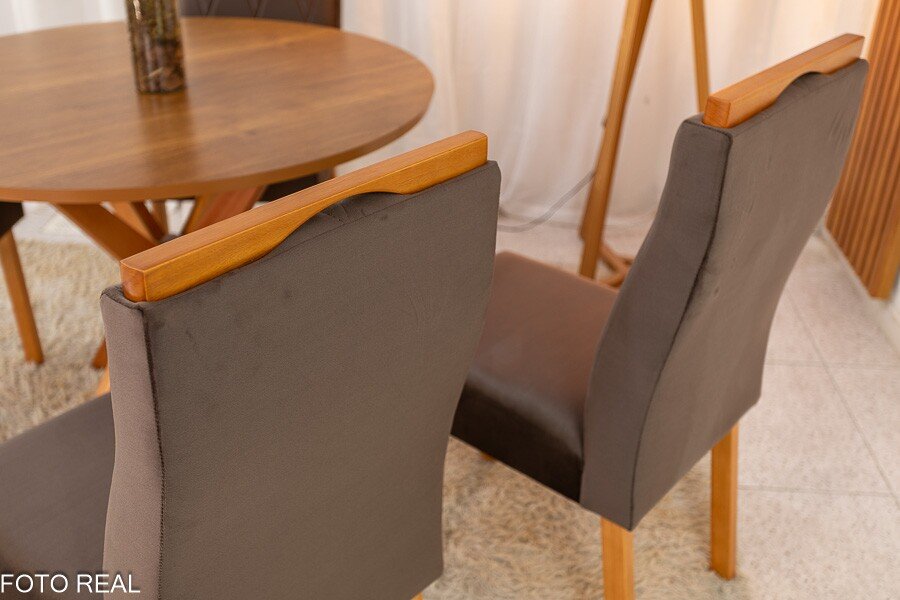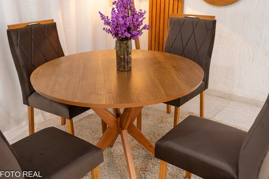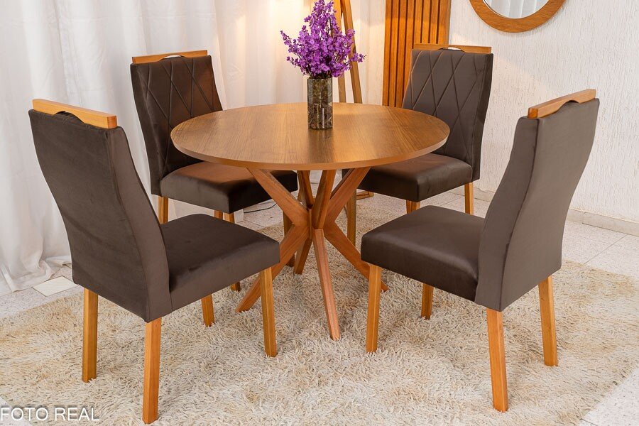 3{%%}Descrição{%%}Mesa de Jantar Simpatia Tampo Redondo 108×108 Cinamomo 4 Cad. Lisboa Veludo Marrom 509 Madeira Maciça – Entregue Montada