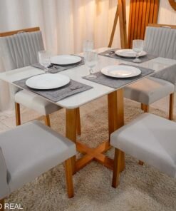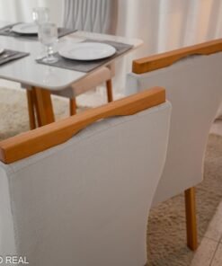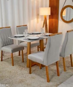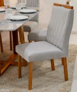 3{%%}DESCRIÇÂO{%%}Mesa Pedro Mel Vidro OFF 120×80 4 Cadeiras Genova Veludo Prata 514 Madeira Maciça Art Assento – Entregue Montada