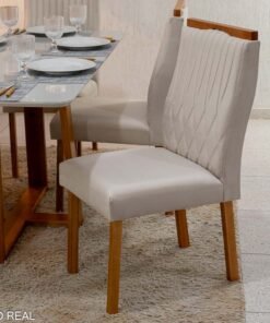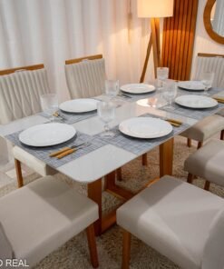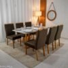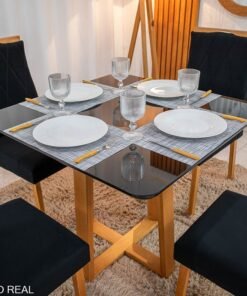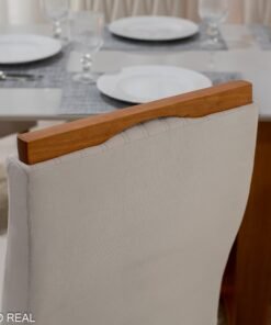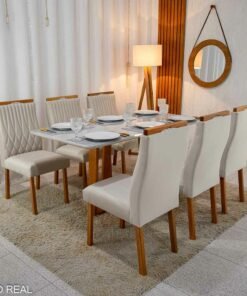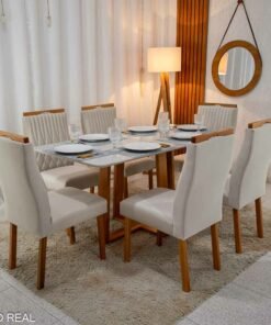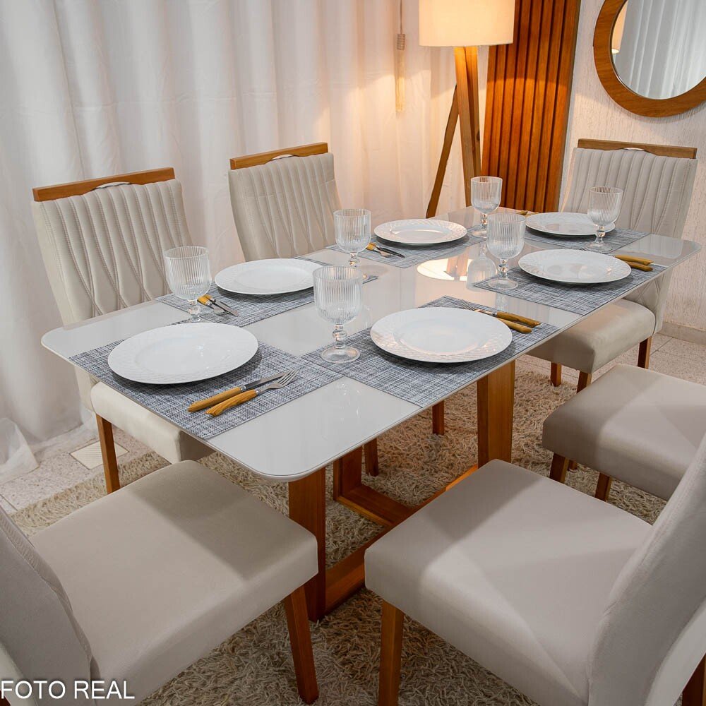 3{%%}DESCRIÇÂO{%%}Mesa Pedro Mel Vidro OFF 160×80 6 Cadeiras Genova Veludo Cinza 507 Madeira Maciça Art Assento – Entregue Montada