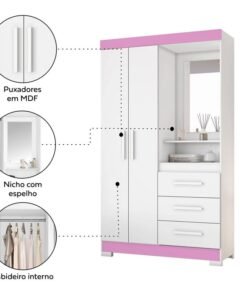 3{%%}Descrição{%%}Roupeiro Solteiro NT 6020 Branco/Rosa 2 portas 3 Gavetas Flex C/Pés Larg. 1.08m – Notável