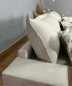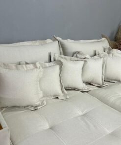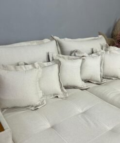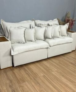 Todo revestido em linho, com detalhes em couro.