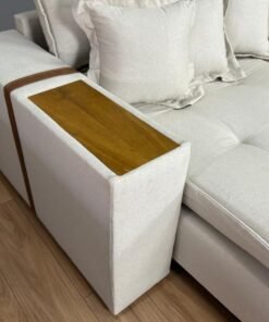 Braço com 25cm de largura, detalhes em couro e tampo de madeira no braço.