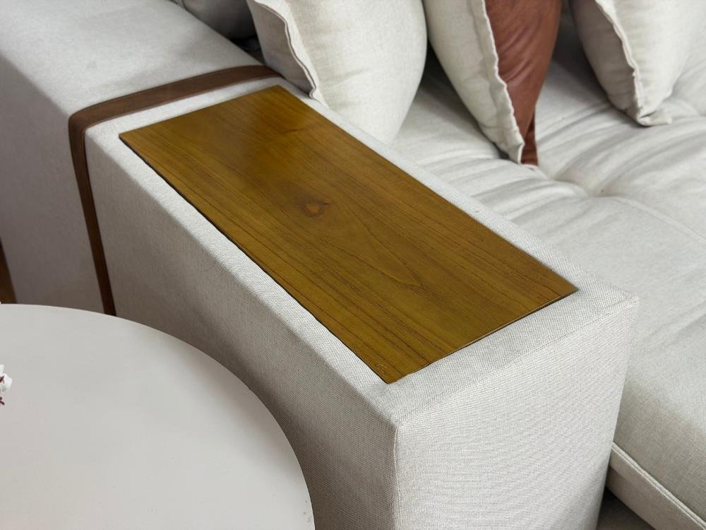 Braço com 25cm de largura, detalhes em couro e tampo de madeira no braço.