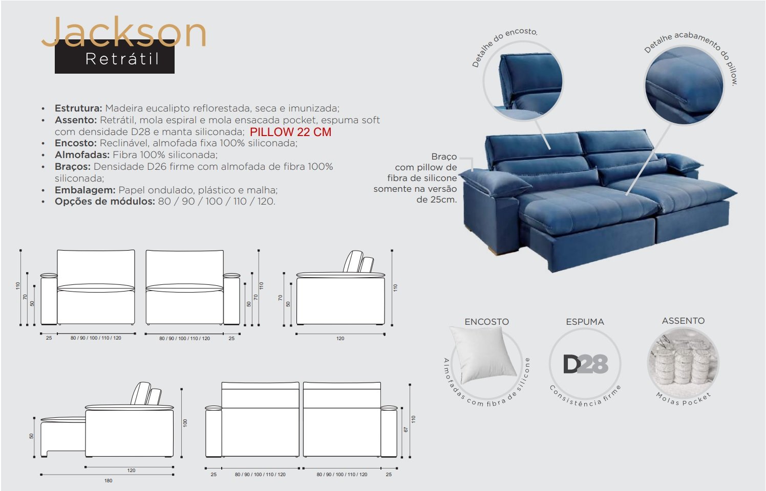 – Encosto reclinável com almofadas fixas 100% fibra siliconada