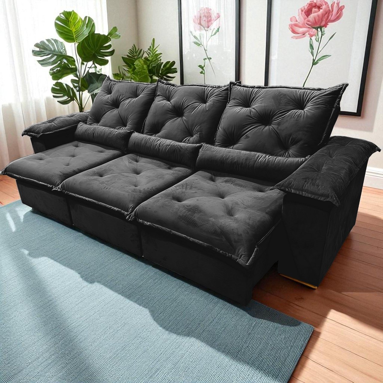 Sofá Retrátil e Reclinável Porto Madero 2,75 m Veludo Preto – IMPERIAL DECOR