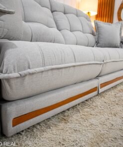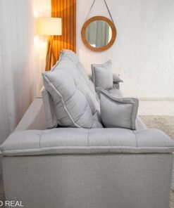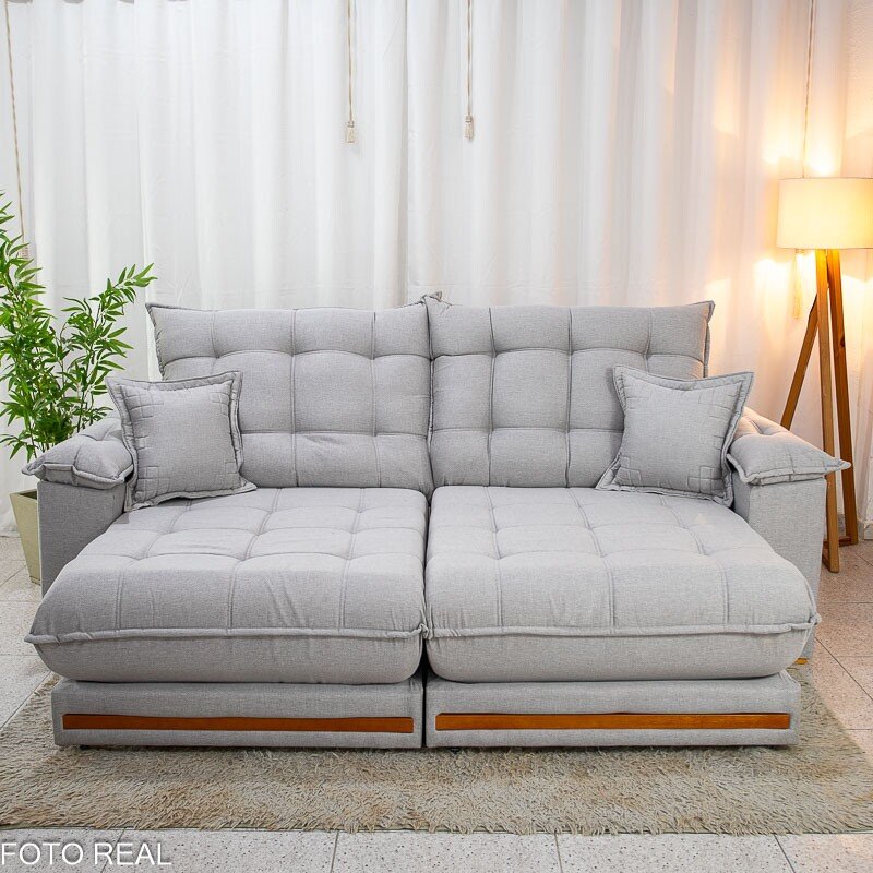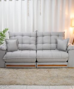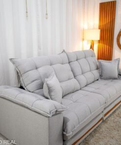 3{%%}Descrição{%%}Sofá Retrátil Reclinável Barcelona 2.30m Linho Cinza Claro 461 C/ 2 Almofadas – D33 e Molas Ensacadas Pocket