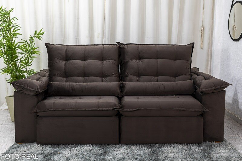 3{%%}Descrição{%%}Sofá Retrátil Reclinável Emanuelly 2.30m Veludo Marrom – D28 Soft
