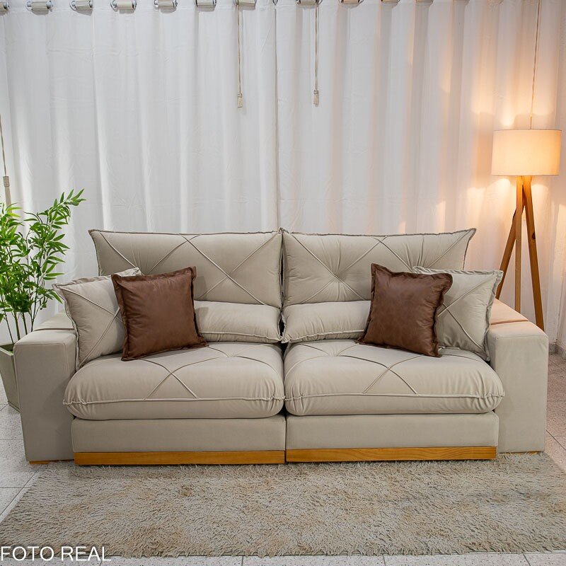 3{%%}Descrição{%%}Sofá Retrátil Reclinável Gran Bello 2.50m Veludo Bege Claro – Molas Ensacadas Pocket