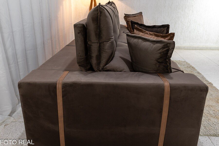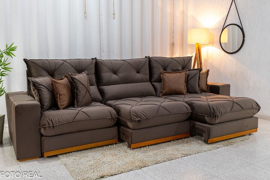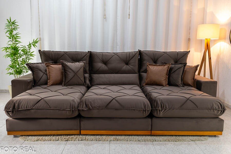 3{%%}Descrição{%%}Sofá Retrátil Reclinável Gran Bello 3.20m Veludo Marrom – Molas Ensacadas