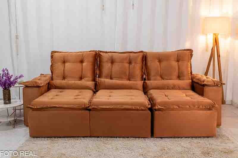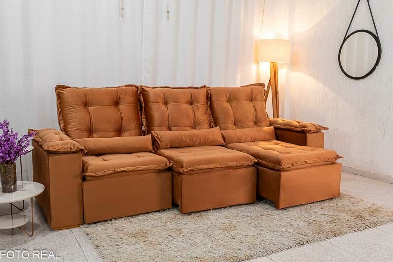 3{%%}Descrição{%%}Sofá Retrátil Reclinável Grécia Veludo Terracota Larg. 2.70m – Sem Caixa