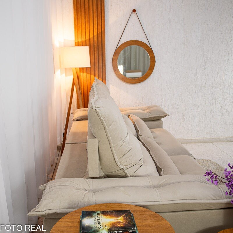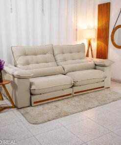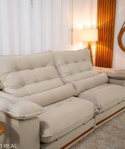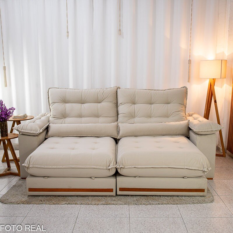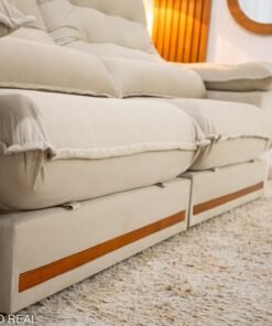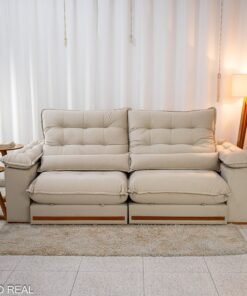 3{%%}Descrição{%%}Sofá Retrátil Reclinável Istambul 2.50m Veludo Bege 406 – Espuma D33
