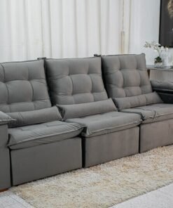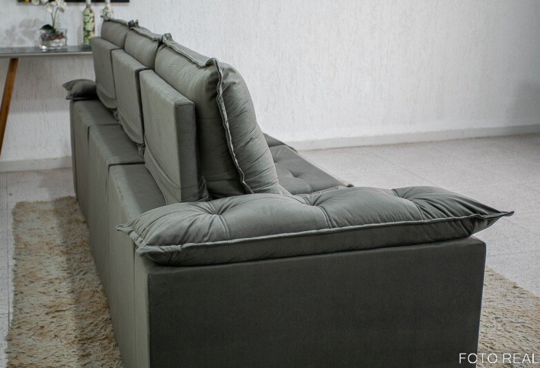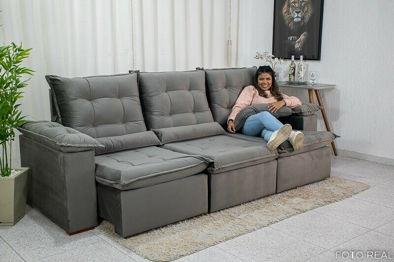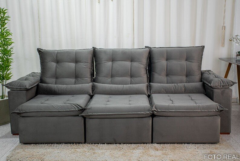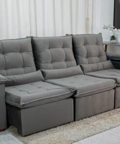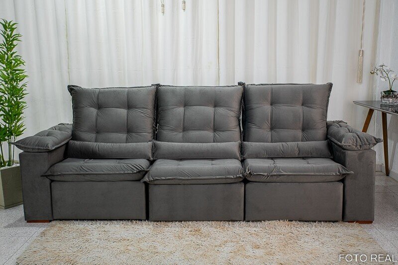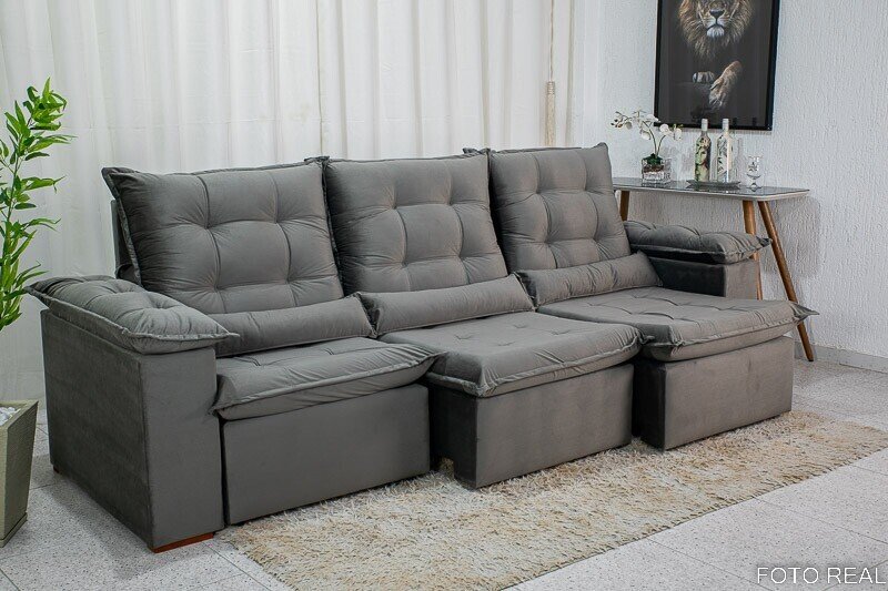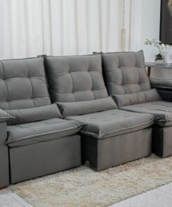 3{%%}Descrição{%%}Sofá Retrátil Reclinável Madri 2.70m Veludo Cinza 20 – D28 Soft