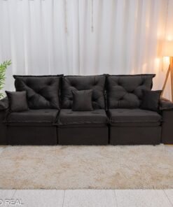 No assento, o conforto é garantido pela espuma D28 Pró Aditivada com 18cm de espessura, sustentação em percintas elásticas e corrediças de ferro com sistema de freio. O encosto é reclinável, com várias posições, e vem com duas almofadas decorativas de brinde, além do braço com pillow top macio, ideal para apoiar os braços ou até deitar.