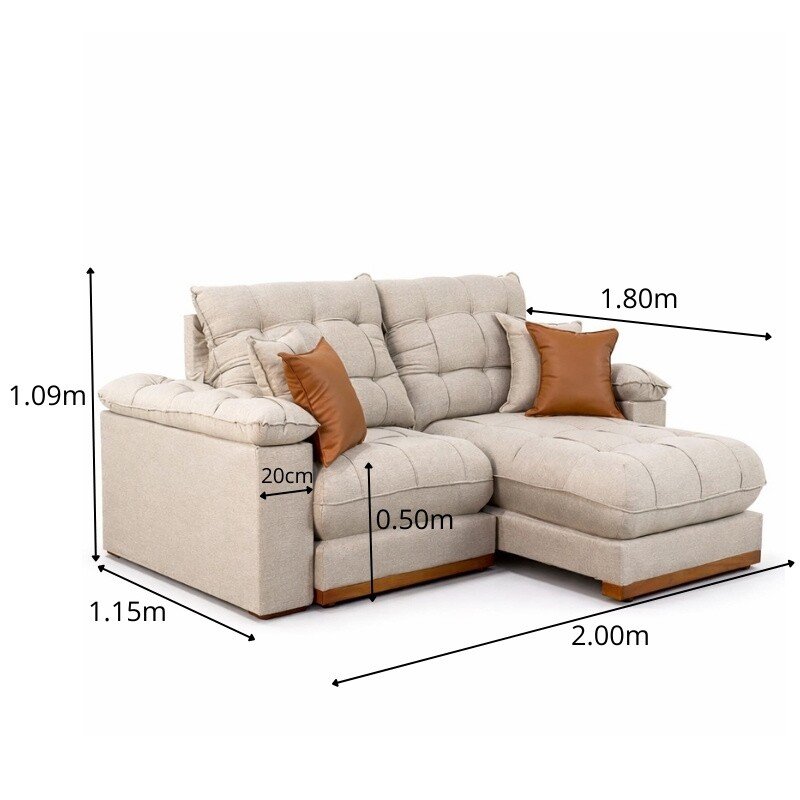 Sofá Retrátil Reclinável Verona 2.00m Linho Bege D28 Soft – Molas Ensacadas Medidas: – Largura: 2.00m – Altura: 1.09m – Assento fechado: 1.15m – Assento aberto: 1.80m – Altura do assento até o chão: 0.50m – Largura dos braços: 0.20m – Sofá retrátil para até 3 pessoas – Passa em portas de 0.75m Assento: – Tipo: Retrátil com corrediças em tubo de ferro – Pillow Top: 30 cm de espessura – Espuma: D28 Soft de alta densidade – Molejo: Molas ensacadas Pocket individuais – Sustentação: Madeira de eucalipto – Rodízios: Rodinhas siliconadas que facilitam o deslizamento Encosto: – Tipo de encosto: Reclinável com várias posições – Enchimento: Fibra de poliéster siliconado de alto conforto – Sistema de inclinação: Catraca de ferro blindado Braços: – Pillow Top de Fibra de poliéster siliconado Estrutura: – Tipo de madeira: Eucalipto de reflorestamento Revestimento: – Tecido: Linho Peso indicado: – Recomendado até 120 kg por pessoa Bônus: – Acompanha almofadas decorativas Aviso importante: Informamos que é normal haver uma abertura entre os módulos dos sofás retráteis. Essa abertura é necessária para evitar atrito entre os módulos durante o movimento de abrir e fechar, prevenindo o desgaste do tecido. As cores podem sofrer variações dependendo da luminosidade, tipo de câmera, ou mesmo a visualização das imagens em computadores ou notebooks com telas LCD ou LED, tablets ou smartphones dependendo da quantidade de pixls, podendo deixar as imagens com cores mais opacas ou cores mais vibrantes. Benefícios das molas ensacadas
