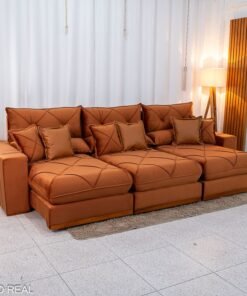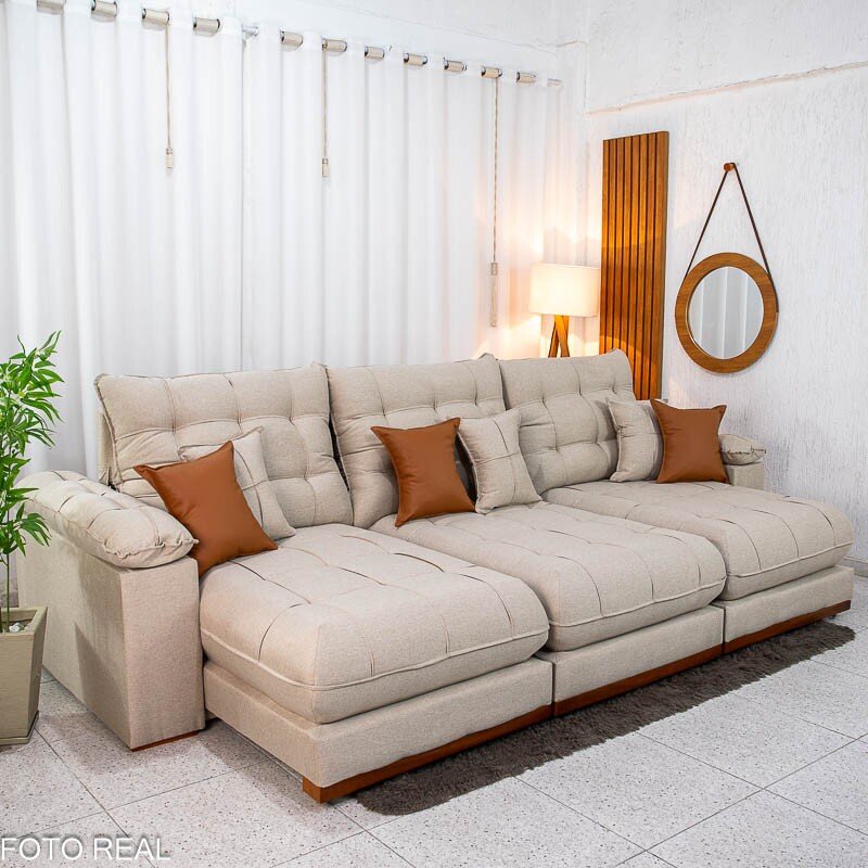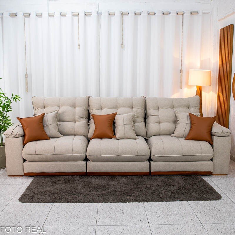 Sofá Retrátil Reclinável Verona 3.20m Linho Bege D28 Soft – Molas Ensacadas Medidas: – Largura: 3.20m – Altura: 1.09m – Assento fechado: 1.15m – Assento aberto: 1.80m – Altura do assento até o chão: 0.50m – Largura dos braços: 0.20m – Sofá retrátil para até 7 pessoas – Passa em portas de 0.75m Assento: – Tipo: Retrátil com corrediças em tubo de ferro – Pillow Top: 30 cm de espessura – Espuma: D28 Soft de alta densidade – Molejo: Molas ensacadas Pocket individuais – Sustentação: Madeira de eucalipto – Rodízios: Rodinhas siliconadas que facilitam o deslizamento Encosto: – Tipo de encosto: Reclinável com várias posições – Enchimento: Fibra de poliéster siliconado de alto conforto – Sistema de inclinação: Catraca de ferro blindado Braços: – Pillow Top de Fibra de poliéster siliconado Estrutura: – Tipo de madeira: Eucalipto de reflorestamento Revestimento: – Tecido: Linho Peso indicado: – Recomendado até 120 kg por pessoa Bônus: – Acompanha almofadas decorativas Aviso importante: Informamos que é normal haver uma abertura entre os módulos dos sofás retráteis. Essa abertura é necessária para evitar atrito entre os módulos durante o movimento de abrir e fechar, prevenindo o desgaste do tecido. As cores podem sofrer variações dependendo da luminosidade, tipo de câmera, ou mesmo a visualização das imagens em computadores ou notebooks com telas LCD ou LED, tablets ou smartphones dependendo da quantidade de pixls, podendo deixar as imagens com cores mais opacas ou cores mais vibrantes. Benefícios das molas ensacadas